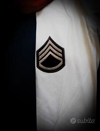 Vendo giacca vintage color crema con dettagli militari. Presenta due patch distintivi: uno triangolare con il numero 8 e simboli militari e uno a forma di sergente. La giacca ha chiusura con zip, due tasche frontali e polsini elasticizzati.