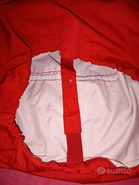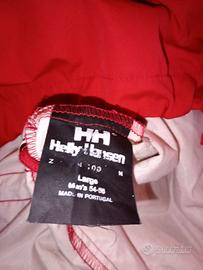 Giacca a vento anorak (pullover) Helly Hanson tg.L, rossa con cappuccio e un cordino regolabile in vita e cordino regolabile sul fondo con all'interno una fascia che allunga o accorcia la giacca. Ha una tasca a marsupio ampia e due tasche laterali chiuse da bottoni. È un modello considerato vintage ha le iniziali della marca ricamate sul davanti.