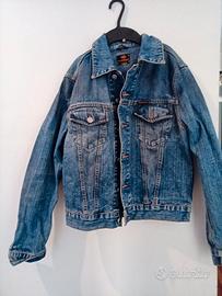 giacchetto in jeans, taglia small, usato ma ben conservato, senza particolari segni di usura, presenta solo uno strappo sulla targhetta interna