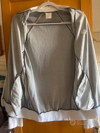 Vendesi giacchetto in acetato, color blu con colletto, polsi e vita in elastico bianco, doppia tasca, taglia M (misure: spalle 48cm, petto 58cm, vita 44cm, lunghezza 70cm), marca Arena.