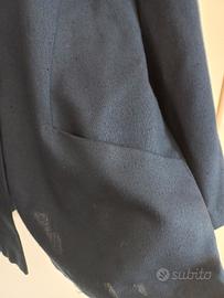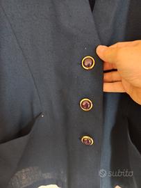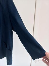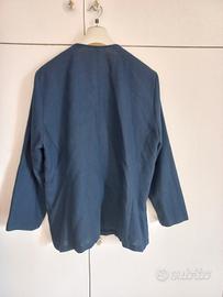 Giacchina da donna blu in cotone scollo a V a maniche lunghe con bottoni e tasche laterali.