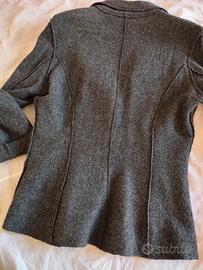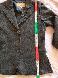 Deliziosa giacchina grigio antracite . Colletto con rever a lancia impreziosito da un fiore in lana e pailletes, chiusura 3 bottoni quadrati neri lucidi. Linea leggermente sciancrata. Molto femminile. veste taglia 44. tessuto misto lana, viscosa, poliestere ( vedi etichetta), lunghezza da spalla all'orlo cm 60.