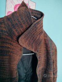 Giacchina /blazer vintage,per donna, corta in vita,con zip davanti,un poco elasticizzata, in cotone vellutato al tatto,stoffa stampata fantasia in nero e marrone.la taglia non è segnata ma veste taglia 42, giusta, aderente