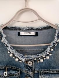 Giubbino Jeans con collo alla coreana con perle applicate inserti in velluto. Vestibilità 44/46
