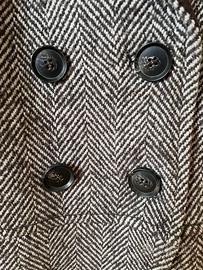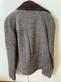 Sfiziosa giacchina corta in lana spigata nei toni del marrone, Mango collection. Il collo e i revers sono scamosciati color marrone scuro, così come le due taschine aperte sul davanti. È dotata di quattro bottoncini di chiusura sul davanti e completamente foderata in raso marrone scuro al suo interno. Taglia L, 44 IT.