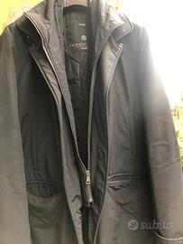 Giaccone sportivo imbottito, nero, parte interna sul davanti asportabile chiusa da zip per una maggiore protezione, tasche interne chiuse da zip, in perfette condizioni. Misure da spalla a spalla 50 cm., da ascella/ascella 60 cm. Taglia 52
