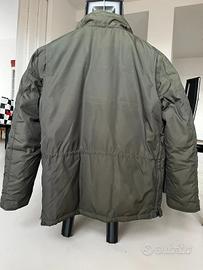 Field jacket in nylon colore verde Tiglio Selvatico, imbottitura in piuma d'oca, con cuciture termosaldate e quattro tasche sul davanti.