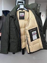 Caratteristico passante Blauer cucito sul petto a sinistra, due zip sul fondo ai lati della giacca con fettuccia elastica e bottoni automatici.
