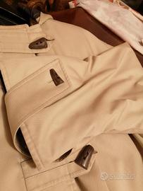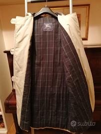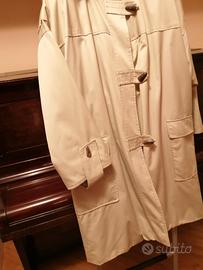 Giaccone per donna lunghezza 3/4 prodotto da Burberry's in England per la ditta Galtrucco di Milano prima dell'anno 2001 anno in cui il negozio Galtrucco di piazza del Duomo chiuse.Il giaccone è di linea a sacchetto,molto ampia e comoda ,con cappuccio e due tasche applicate.Sia il tessuto esterno sia la fodera interna flanellata sono 50%cotone e 50%poliestere con leggera imbottitura sempre in poliestere.Da notare I bottoni in corno naturale.