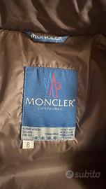 Giaccone Moncler marrone scuro. Taglia 6, corrispondente ad una 54/56 italiana. Abbottonatura centrale con zip e bottoni a pressione, coulisse in vita regolabile, due tasche esterne e una interna , cappuccio staccabile regolabile con coulisse
