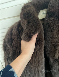 Elegante giaccone in volpe, modello oversize dal taglio contemporaneo. Colore marrone intenso e striato sulle punte del pelo. Leggero e ben rifinito con fodera in saten. Un capo che aggiunge un tocco di lusso.