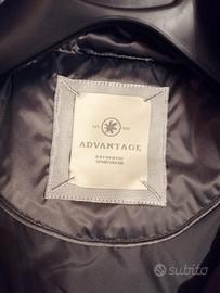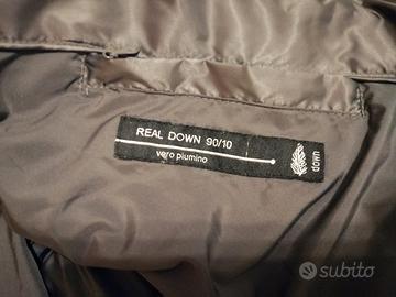 Imbottitura vero piumino, taglia M, marca Advantage. Esterno nylon, fodera polyester, cappuccio con pelliccia asportabile e cintura sfilabile.