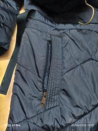 Giaccone per donna a vestibilità lunga. Materiale in nylon anti pioggia con imbottitura in poliestere. Il giaccone viene venduto senza cappuccio (smarrito),dotato di tasche laterali e un cordoncino al fianco per regolarlo in sfiancatura. Oltre ad evidenziare la taglia dichiarata,aggiungo misure in cm. Capo in buone condizioni.