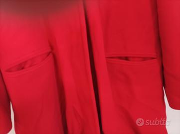Giaccone donna (Cod A14), con bottoni gioiello. Interno foderato, 2 tasche anteriori, si chiude col solo bottone in alto. Bello ed elegante. Cappuccio con colori a contrasto, non si stacca. Spalline, rosso brillante, made in Italy. Senza targhetta tessuto, credo lana. Senza targhetta tg, credo XL, misure: spalle 52, ascelle 65, lunghezza 91. Ha bisogno di una rinfrescata in tintoria. Ottime condizioni. Non spedisco INPOST