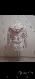 Giacca trapuntata effetto manopesca, con imbottitura sintetica. Color panna, multitasche interne ed esterne, con cappuccio leggero a scomparsa (zip nel colletto), chiusura doppia con cerniera e bottoni. Interno collo e bordature varie in tessuto millerighe simil vellutino. Tg. 46 da etichetta, veste più slim. Il prezzo tiene conto di alcuni aloni gialli sull'interno collo (capo già lavato ed igienizzato) e dell'elastico slabbrato nella parte interna antivento dei polsini (vedere ultime foto).