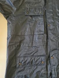Giaccone uomo impermeabile, con cappuccio ripiegato nel colletto, maniche e vita regolabili, tasconi e taschine. larghezza spalle 58 cm lunghezza 90 cm