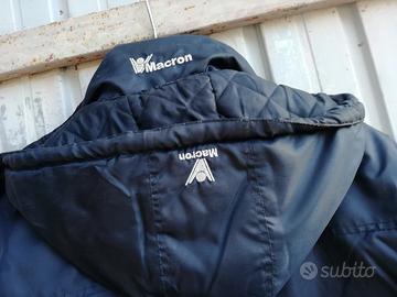 Giaccone lungo Macron taglia XXL colore blu scuro. Imbottitura interna, quattro tasche esterne tipo eskimo, cappuccio imbottito, staccabile. Capo leggero, ma molto caldo.
