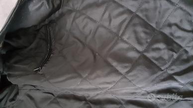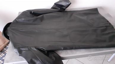 Giaccone lungo uomo in vera pelle nera (tipo Matrix). Cerniera centrale, due tasche esterne ed una interna. Trapuntato internamente. Taglia 48. Pelle un po' rigida. Misure: collo 48 cm, spalle 47 cm, manica 64 cm, torace 57 cm lunghezza 98 cm.