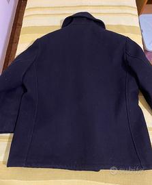 Giaccone originale Marina Militare U.S.A., marca Fox Knodd, in tessuto 50% Lana, 50% viscosa, fodera trapuntata 100% poliestere, doppiopetto con 6 bottoni neri, chiusura ambidestra, due tasche anteriori, taglia 50, made in U.S.A., ottimo stato.