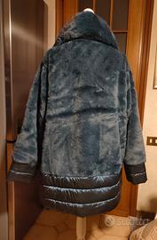 Giaccone in pelliccia ecologica della Neropale, colore azzurro denim, ampio collo staccabile, linea svasata, chiusura con cerniera a doppio cursore, 100% da PET riciclato. Riporta come taglia 3XL ma veste molto più ampio perché acquistata come tg. 50 purtroppo mi sta enorme per cui rivendo. Controllate bene le misure perché per me veste una 54.