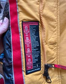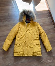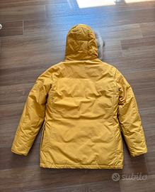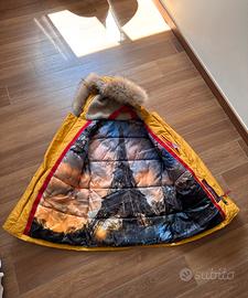 GIACCONE STILE PARKA NEW CAMPIGLIO CON DETTAGLIO IN PELLICCIA. Nuova collezione autunno/inverno 24/25. Piumino lungo imbottito, cappuccio bordato in pelliccia, colore giallo per uomo taglia S. Marca Freedomday. collo alto, cappuccio non rimovibile con dettaglio in pelliccia rimovibile, maniche lunghe con polsi elasticizzati, chiusura con zip a due vie e chiusura con bottoni. Tasche frontali con patta e bottone. Nuovo ha solo una macchiolina vedi toto.