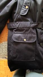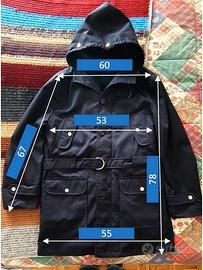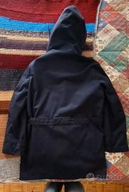 Giaccone sfoderabile da mezza stagione colore blu scuro. Taglia 48. In misto cotone/poliestere come da etichetta. in foto. Completo di cappuccio, tasconi e taschini. Chiusure con automatici a pressione. Completamente sfoderabile. Misure principali in dettaglio nell'ultima foto. In perfette condizioni.