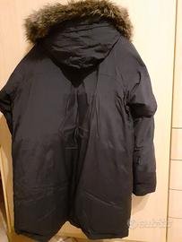 Giaccone blu scuro, con cerniera davanti, con quattro tasche esterne e due interne, molto caldo e confortevole. TG L