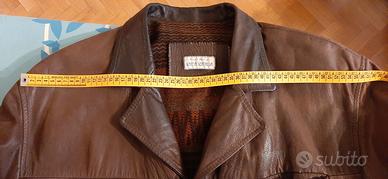 Giaccone invernale pesante in pelle marrone color cuoio scuro. Indossato e molto bello. Confezionato da ditta artigiana della zona, pertanto la misura 52 è puramente indicativa. Ben rifinito, 2 tasche anteriori e taschino interno, spacchetti laterali, chiusura 4 bottoni con occhielli. La taglia è grande e le misure sono tutte riportate in foto, la lunghezza per maggior precisione misurata da sotto ascella.