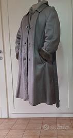 Cappotto uomo in montone, pelle fuori, pelo interno, lungo con cintura, tasche a filo, spacco dietro, colore grigio verde, condizioni ottime senza difetti, usato poco da persona raffinata