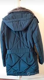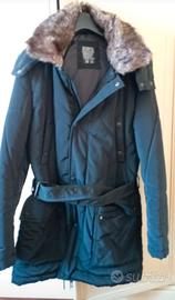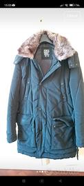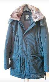 Vendo come nuovo giaccone uomo Pull &Bear, taglia media, trapuntato, colore nero, con pelo al collo e cappuccio entrambi asportabili, quattro tasche due dritte e due oblique, due tasche interne, cintura sul girovita, chiusura a bottoni e con zip lunghezza cm. 80, da spalla a spalla cm. 48. Molto comodo e caldo.