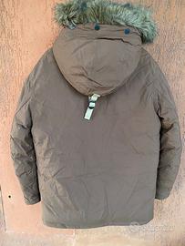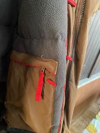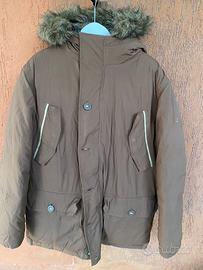 Giaccone uomo Timberland, in tessuto impermeabile, cappuccio con pelliccia sintetica staccabile, chiusura con bottoni e zip, con tasche sul petto, due anteriori e una interna, colore tonalità marrone, tg. M, ottima qualità, ottimo stato.