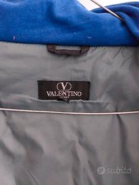 Bellissimo giaccone originale Valentino sport. Taglia 52, colore nero, foderato in pile blu, imbottito, chiuso con cerniera, 4 tasche -molto ampie- esterne (di cui due chiuse da cerniera) e due ben capienti interne (chiuse con un cm di velcro). Comodo cappuccio, anch'esso foderato in pile. Molto caldo e comodo, sia per la forma abbondante che che per il tessuto usato; a ciò si aggiunge la qualità ed il prestigio del grande marchio Valentino. Usato poco e tenuto in perfetto ordine, pulito, cerniere perfettamente funzionanti, non presenta alcuna rottura, buco o altro del genere.