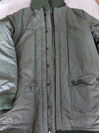 Comodo e caldo giaccone color verde salvia scuro, taglia 50, chiuso da cerniera (perfettamente funzionante) e bottoni automatici, con due capienti tasche da entrambi i lati in cui può essere indossato, chiuse da bottoni automatici; le maniche invece sono chiuse da polsini in maglia.