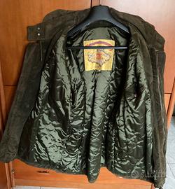 Giaccone vintage originale realizzato in pelle bovina scamosciata spessa e resistente, un materiale di alta qualità noto per la sua durabilità e capacità di protezione dal freddo e dal vento.