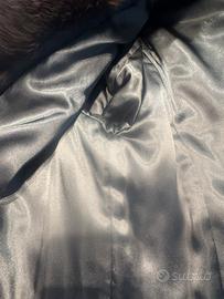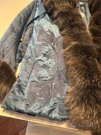 Piumino con pelliccia di volpe, colore blu con ricami sul davanti collo che volendo si puo arricciare. Tg 44 spalle 42 lunghezza 78 maniche 57 con polso di volpe come da foto.