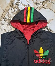 Stile unico per gli amanti del genere! Vendo questo gilet smanicato Adidas Originals con l’iconico logo a trifoglio e strisce nei colori rasta (rosso, giallo, verde). Un pezzo perfetto per festival, concerti o per un look streetwear deciso.