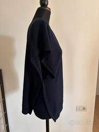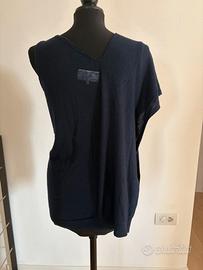 Gilet di maglia leggera in mohair lavorato lento, un po’ trasparente dalle vestibilità molto particolare. Da un lato è doppiato come se avesse un altro mezzo gilet da abbotonare sul fianco come da foto. Colore blu taglia S.