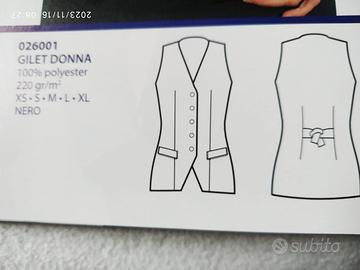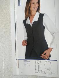 Gilet donna in poliestere, modello sciancrato, 5 bottoni, lunghezza a coprire i fianchi disponibili. colore blu per barista, cameriera. receptionist