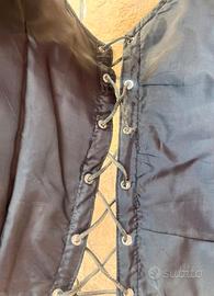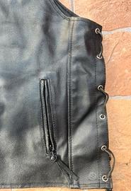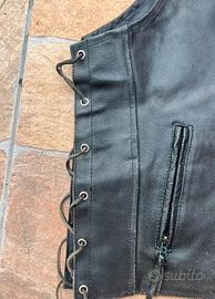 Vendo splendido gilet in vera pelle nera firmato Gaudì Leathers, modello in stile biker/rocker, in condizioni impeccabili (pari al nuovo). Caratteristiche del capo: • Taglia: XL (vestibilità regolare). • Materiale: Vera pelle di alta qualità, robusta e morbida al tatto. • Dettagli unici: Presenta caratteristici intrecci laterali con stringhe in cuoio/pelle che permettono di regolare la larghezza sui fianchi. • Chiusura: Bottoni • Tasche: Due tasche frontali a filetto. • Interno: Foderato internamente per il massimo comfort. • Stato: Indossato pochissimo, pelle perfettamente idratata, nessun segno di usura o odore. Perfetto per motociclisti o per chi cerca un capo di carattere da abbinare a una camicia o una t-shirt.