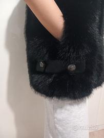 Elegante gilet in ecopelle e in pelliccia sintetica. Marca MoonKiss; di ottima fattura. Non ha etichetta della taglia ma la ragazza che lo indossa ha queste misure: giro seno 90, giro vita 70, giro fianchi 96, altezza 170; e le sta abbondante. IN ECCELLENTE STATO. - Chiusura con zip. - Grande vestibilità. - Bottoni vistosi.