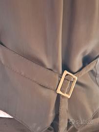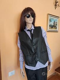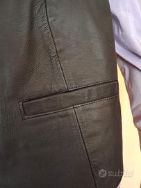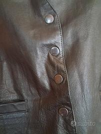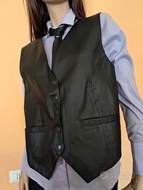 Gilet da donna in pelle Colore nero Materiale: vera pelle Completamente foder6 Fodera interna in poliestere Fodera esterna della parte posteriore in raso di viscosa - Chiusura frontale con bottoni a pressione - Tasche a filo sul davanti Taglia 2 Al manichino, tg 42, ta un po' abbondante; quindi presumo sia una 44/46 italiana Controllare le misure: Lunghezza fino alla punta cm 62 Larghezza da ascella ad ascella cm 51,5 Larghezza spalle cm 39 Nella parte posteriore cinturetta in raso con fibbia in metallo brunito