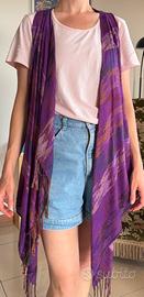 Gilet lungo colore viola, fatto a mano da tessiti recuperati. È un pezzo unico fatto con molta cura da tessuti altrimenti destinati ai rifiuti.