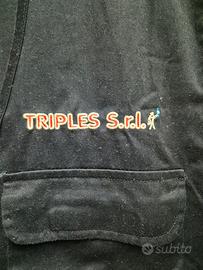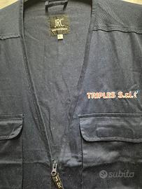 Gilet multitasche da lavoro di colore blu scuro, con chiusura a zip intera, prodotto da JRC - James Ross Collection. Questo modello robusto dispone di quattro pratiche tasche frontali: due superiori con patta e velcro e due inferiori, dotate di un ulteriore scomparto con zip. Il gilet è personalizzato con un logo aziendale ricamato sopra la tasca superiore destra, che riporta la scritta "TRIPLES S.r.l." affiancata da un simbolo grafico, mentre l'etichetta del brand JRC è visibile all'interno del colletto e sul tiretto della cerniera.