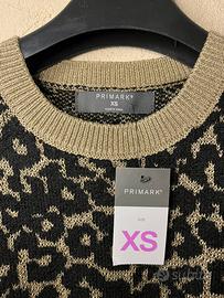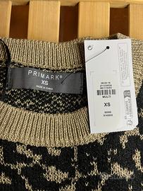 Elegante gilet Primark con fantasia maculata. - Fantasia maculata in oro e nero. - Collo e polsini a costine. - Tessuto morbido e caldo.