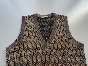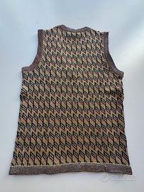 Gilet senza maniche, in maglia oro con disegni geometrici blu e bordeaux, scollo a V, taglia S, donna