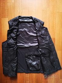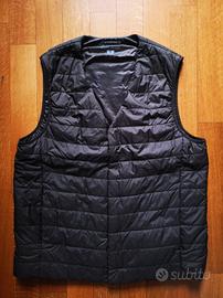 Piumino gilet ultraleggero Puffertech, marca Uniqlo, colore marrone scuro, pratica custodia portatile, finitura idrorepellente, il sistema di chiusura con bottoni a pressione permette di avere sia lo scollo rotondo che a V, taglia S.