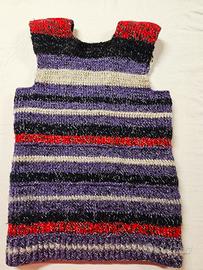 Smanicato, gilet di maglia a righe colorate, fatto a mano artigianale che include fili metallici e scintillanti (lurex), con scollo a V e righe orizzontali. Le fasce sulle spalle sono larghe e strutturate. Realizzato a maglia ai ferri con un filato di misto lana, caratterizzato da striature colorate che includono viola, nero, grigio/bianco e rosso. Il filo ha un effetto bouclé o del lurex per un aspetto brillante. Ottimo per le stagioni freschi o per andare in montagna, unico nel modello e stile, perché e fatto manualmente da mia nonna, Usato pochissimo e in ottime condizioni da come si vede dalle foto. Vestibilità S/M ,le misure nelle foto che sono parte integrante della descrizione.