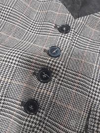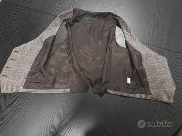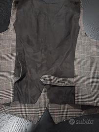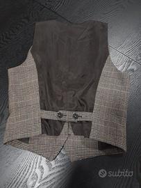 Gilet donna modello reporter tessuto principe di galles firmato Zara Basic in taglia Small, perfetto per chi ama lo stile classico con un tocco contemporaneo. Il capo si distingue per la sua pregiata composizione in misto lana al cinquanta per cento, che lo rende adatto a trecstagioni e strutturato, ideale per completare outfit a strati durante le mezze stagioni. Il design presenta una raffinata fantasia english style a quadri nei toni del marrone e del beige e una finissima riga color ruggine, La chiusura è frontale a quattro bottoni e due tasche finte a filetto che ne rifiniscono il taglio sciancrato. Funzionale cinturino " martingala" regolabile che consente di stringere il punto vita, adattando perfettamente la vestibilità alle proprie forme per un effetto ancora più sciancrato e femminile. Punto vita chiuso due posiziini con cinturino 70 ca.- 78 ca MISURE Lungo davanti 53 cm Dietro 45 cm L'attenzione ai dettagli si nota anche all'interno, dove la fodera in morbido rayon assicura il massimo comfort e una vestibilità impeccabile su camicie o dolcevita. Un gilet versatile che non può mancare nel guardaroba, ottimo sia per un look da ufficio formale abbinato a un pantalone palazzo, sia per un contesto più casual se indossato sopra una t-shirt e un paio di jeans scuri. Il capo è in ottime condizioni e pronto a dare un tocco di eleganza britannica ai tuoi prossimi abbinamenti. Nessuna macchia nessun odore casa si non fumatori. Spedizione accurata e veloce