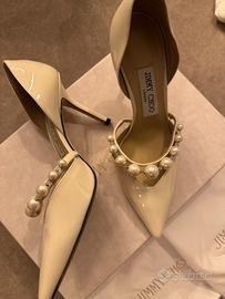 Bellissime décolleté Jimmy Choo, colore beige, impreziosite da dettagli di perle.