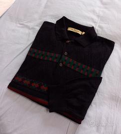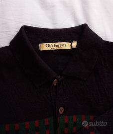 Polo da uomo marchio Giò Ferrari realizzata in 50% lana di colore blu scuro con disegni colore rosso e verde.